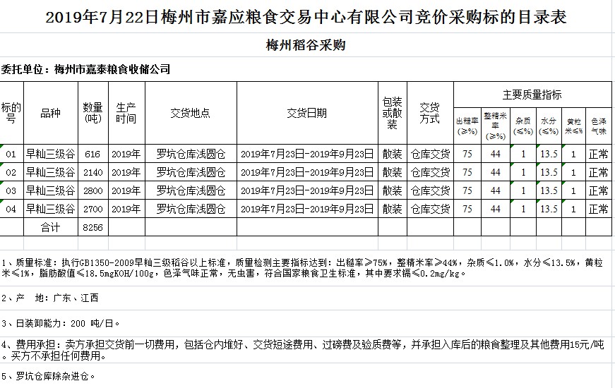 受客戶委托,梅州市嘉應(yīng)糧食交易中心有限公司定于2019年7月22日(星期一)舉辦糧食競(jìng)價(jià)交易會(huì),梅州市嘉泰糧食收儲(chǔ)公司擬采購2019年早秈稻8256噸。
