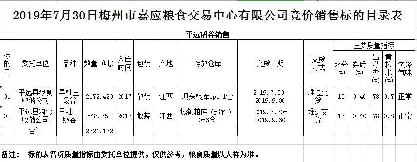 受客戶委托,梅州市嘉應糧食交易中心有限公司定于2019年7月30日(星期二)舉辦糧食競價交易會,平遠縣糧食收儲公司擬銷售2017年早秈稻2721.172噸。