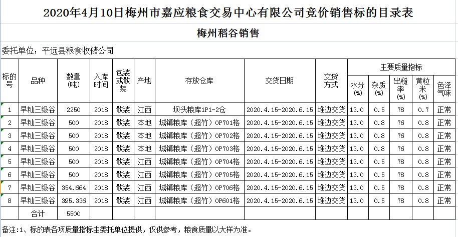 受客戶委托,梅州市嘉應(yīng)糧食交易中心有限公司定于2020年4月10日(星期五)舉辦糧食競價(jià)交易會,平遠(yuǎn)縣糧食收儲公司擬銷售2018年早秈稻5500噸。