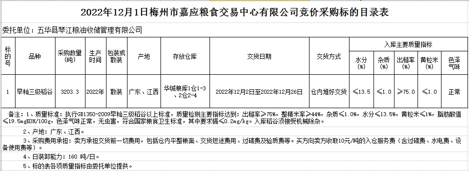 受客戶委托,梅州市嘉應(yīng)糧食交易中心有限公司定于2022年12月1日(星期四)舉辦糧食競價交易會。五華縣琴江糧油收儲管理有限公司擬采購2022年早秈稻3203.3噸。