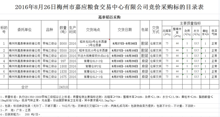 受客戶委托,梅州市嘉泰糧食收儲(chǔ)公司擬采購(gòu)2016年產(chǎn)早秈三級(jí)稻谷24318噸。