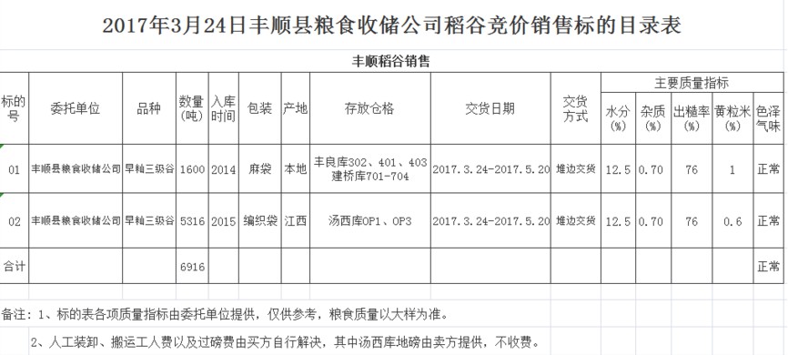 受客戶(hù)委托,梅州市嘉應(yīng)糧食交易中心有限公司定于2017年3月24日舉辦糧食競(jìng)價(jià)交易會(huì),豐順縣糧食收儲(chǔ)公司擬銷(xiāo)售早秈三級(jí)稻谷6916噸。