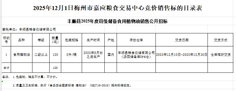受客戶委托,梅州市嘉應(yīng)糧食交易中心有限公司定于2025年12月1日(星期一)舉辦糧食競價交易會。豐順縣糧食收儲有限公司擬銷售2025年食用植物油120噸。