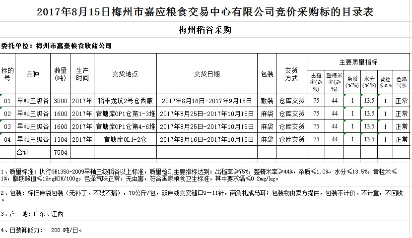 受客戶委托,梅州市嘉應(yīng)糧食交易中心有限公司定于2017年8月15日舉辦糧食競(jìng)價(jià)交易會(huì),梅州市嘉泰糧食收儲(chǔ)公司擬采購(gòu)2017年早秈三級(jí)稻谷共7504噸。