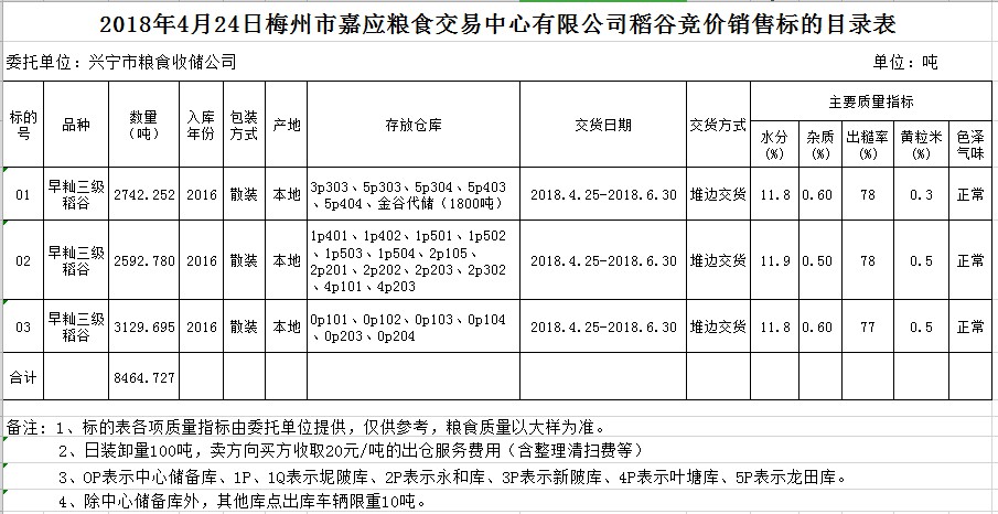交易時間和地點:2018年4月24日(星期二)上午10時。廣東省梅州市彬芳大道南161號梅州市糧食交易中心3樓。