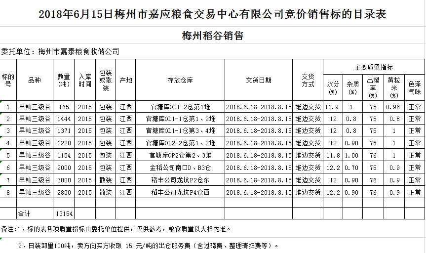 受客戶委托,梅州市嘉應(yīng)糧食交易中心有限公司定于2018年6月15日(星期五)舉辦糧食競價(jià)交易會(huì),梅州市嘉泰糧食收儲公司擬銷售早秈稻13154噸。