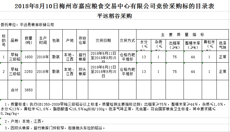 受客戶委托,梅州市嘉應(yīng)糧食交易中心有限公司定于2018年8月10日(星期五)舉辦糧食競(jìng)價(jià)交易會(huì),平遠(yuǎn)縣糧食收儲(chǔ)公司擬采購早秈稻3850噸。